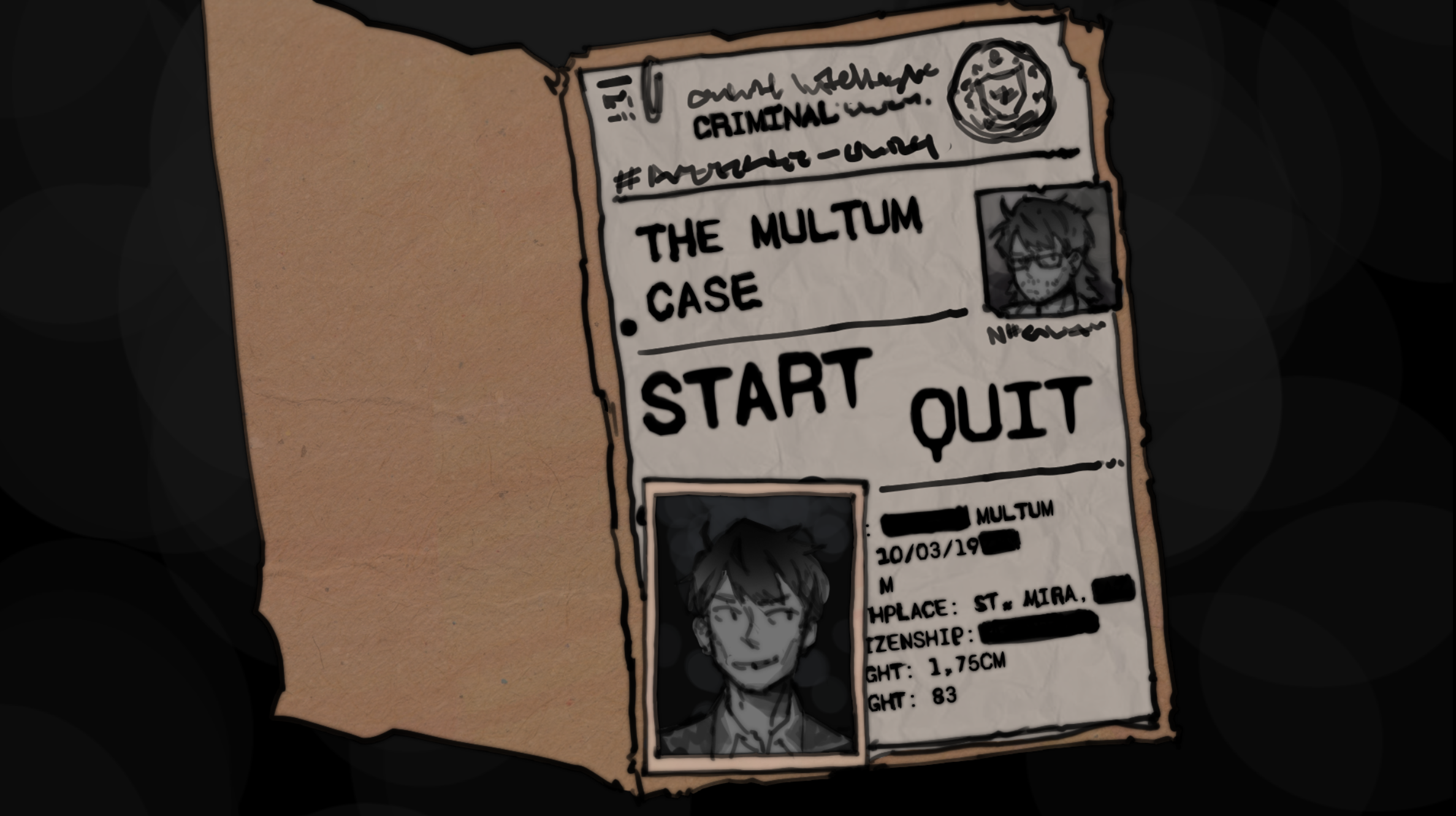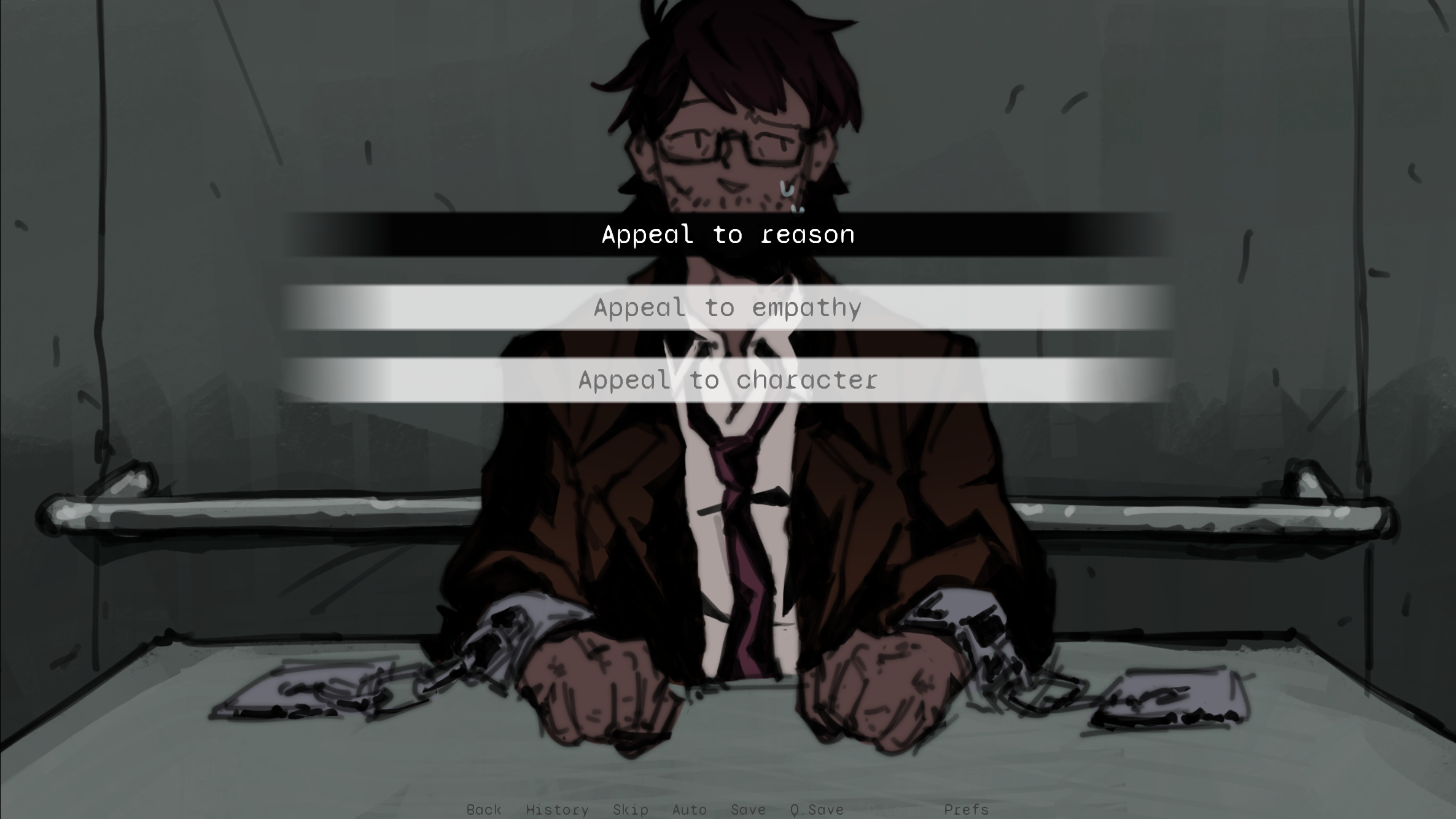 I love how his name plate customises for each choice - The Witness etc. This is so clever! I love everything - especially all the art - your main menu file, his character sprite and expressions, the background. Even your text box. All your design elements connect and show how your whole story comes together for this interrogation. This is so cool!